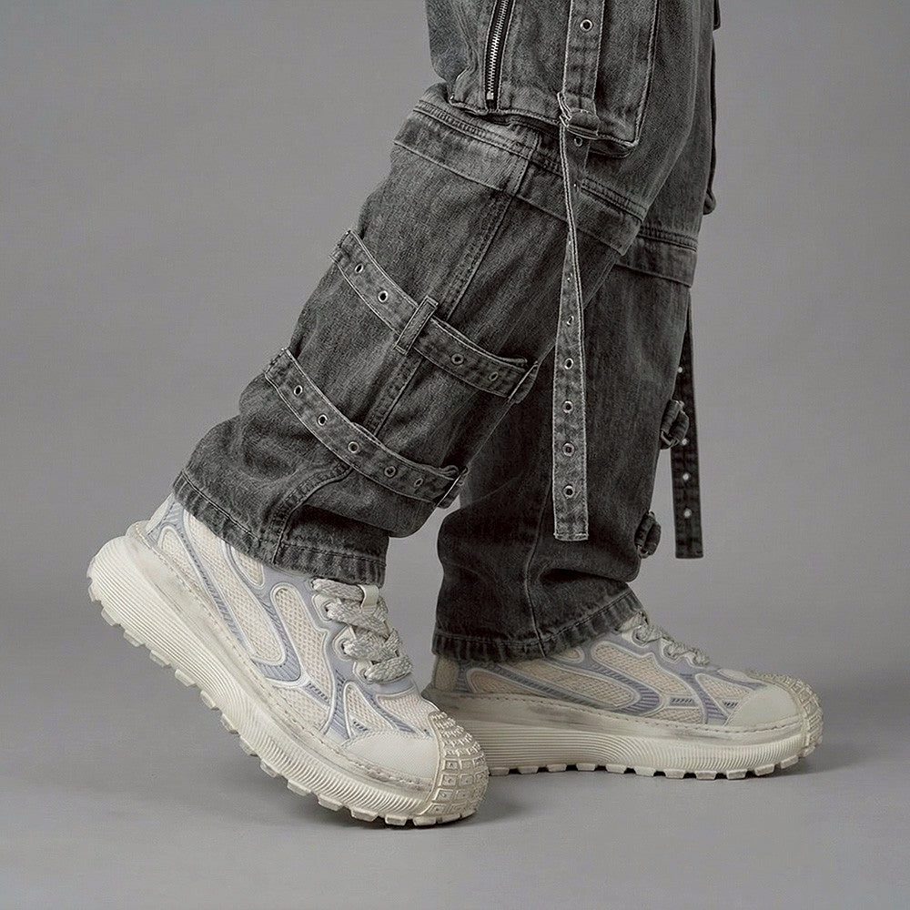 アウトドアギアを思わせる圧倒的なボリュームソールと、構築的なアッパー。トレイル要素と都会的デザインを融合。