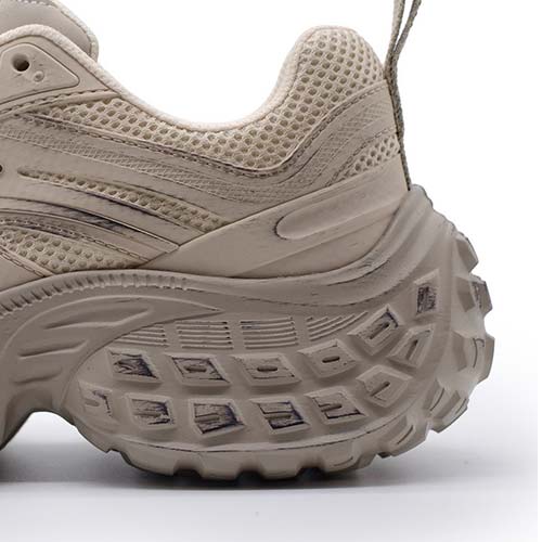 構築的なアッパー。トレイル要素と都会的デザインをビンテージ加工でまとめたデザイン。